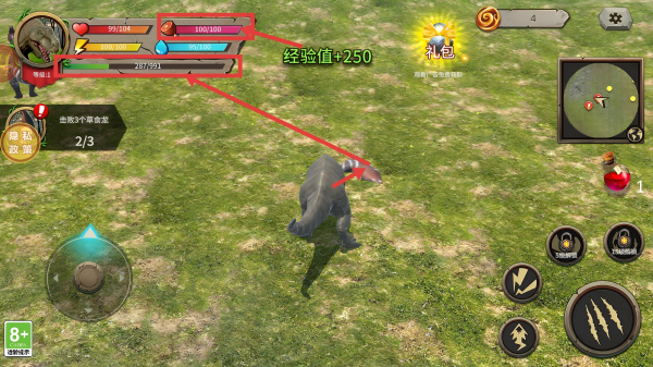 3、击败草食龙后,可获得经验值,提升自身等级进度,同时注意补充生命值、体力等属性,为后续战斗准备。