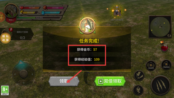 4、完成“击败草食龙”等任务后,界面会显示【任务完成!】,点击【领取】按钮,获取金币与经验值奖励,助力恐龙成长。