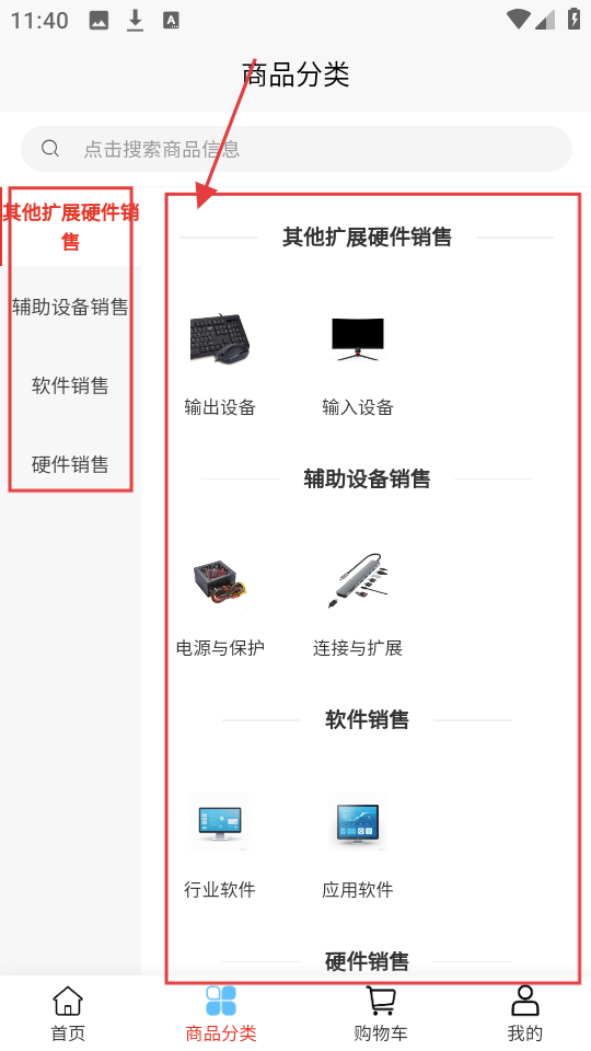 1、在商品分类页,有其他扩展硬件销售等分类,选目标分类,进入对应商品列表页。