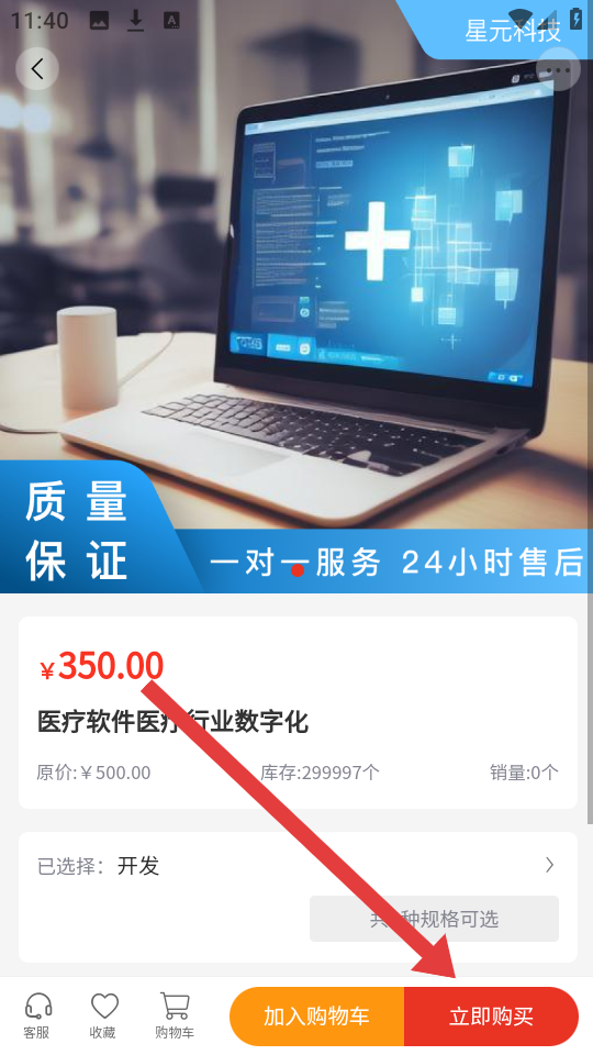 3、在商品详情页,查看价格、库存等信息后,点【立即购买】,进入购买选择界面。
