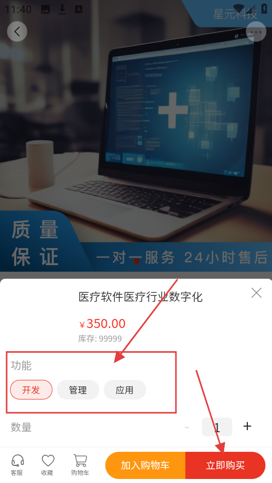 4、在购买选择界面,选功能、数量等,确认后点【立即购买】,完成商品购买流程。