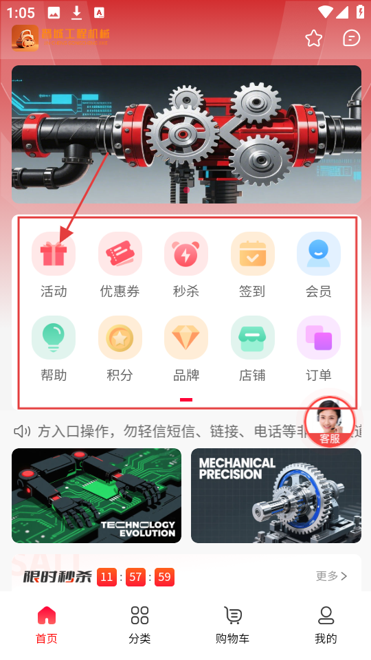 1、在首页,点【活动】图标,进入活动页面,可查看各类优惠活动及相关商品。