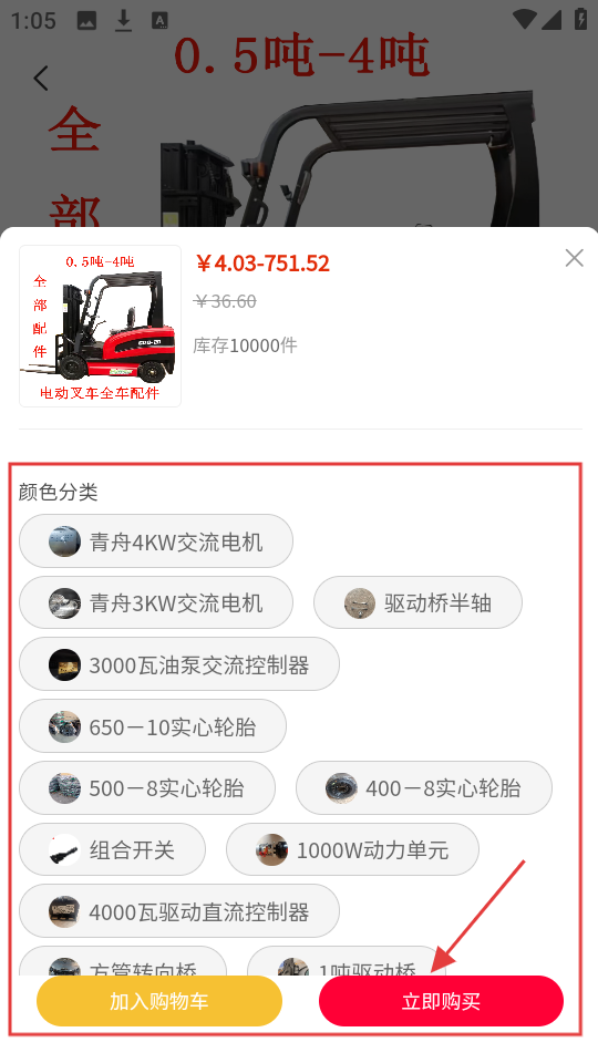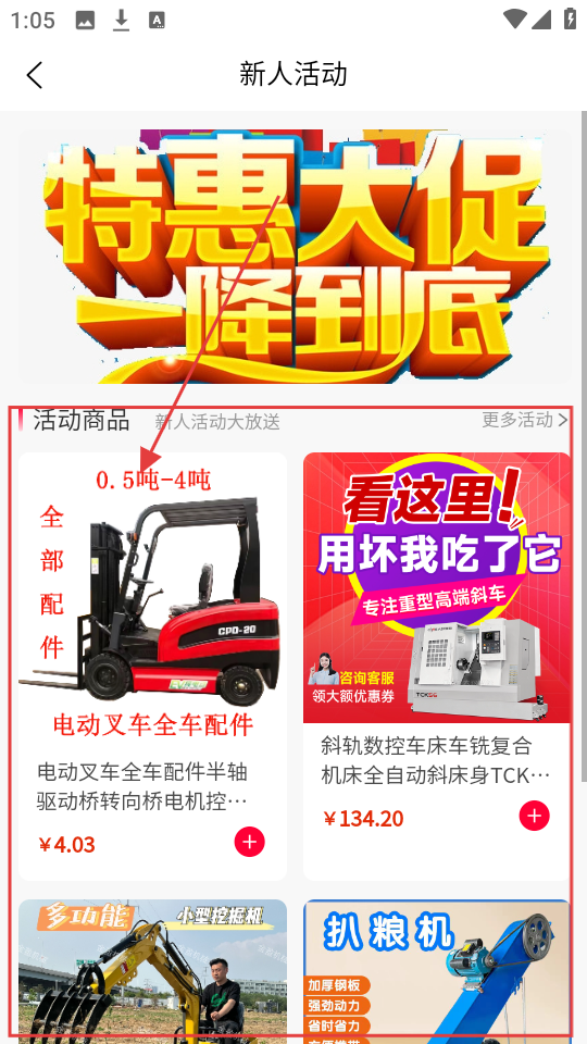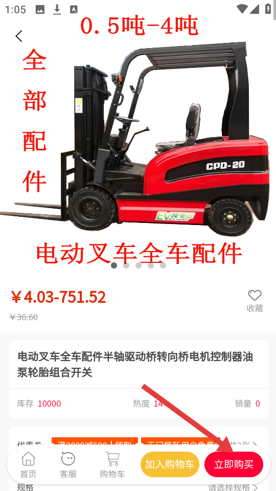 2、在活动页面,有电动叉车全车配件等活动商品,选目标商品,进入其详情页。