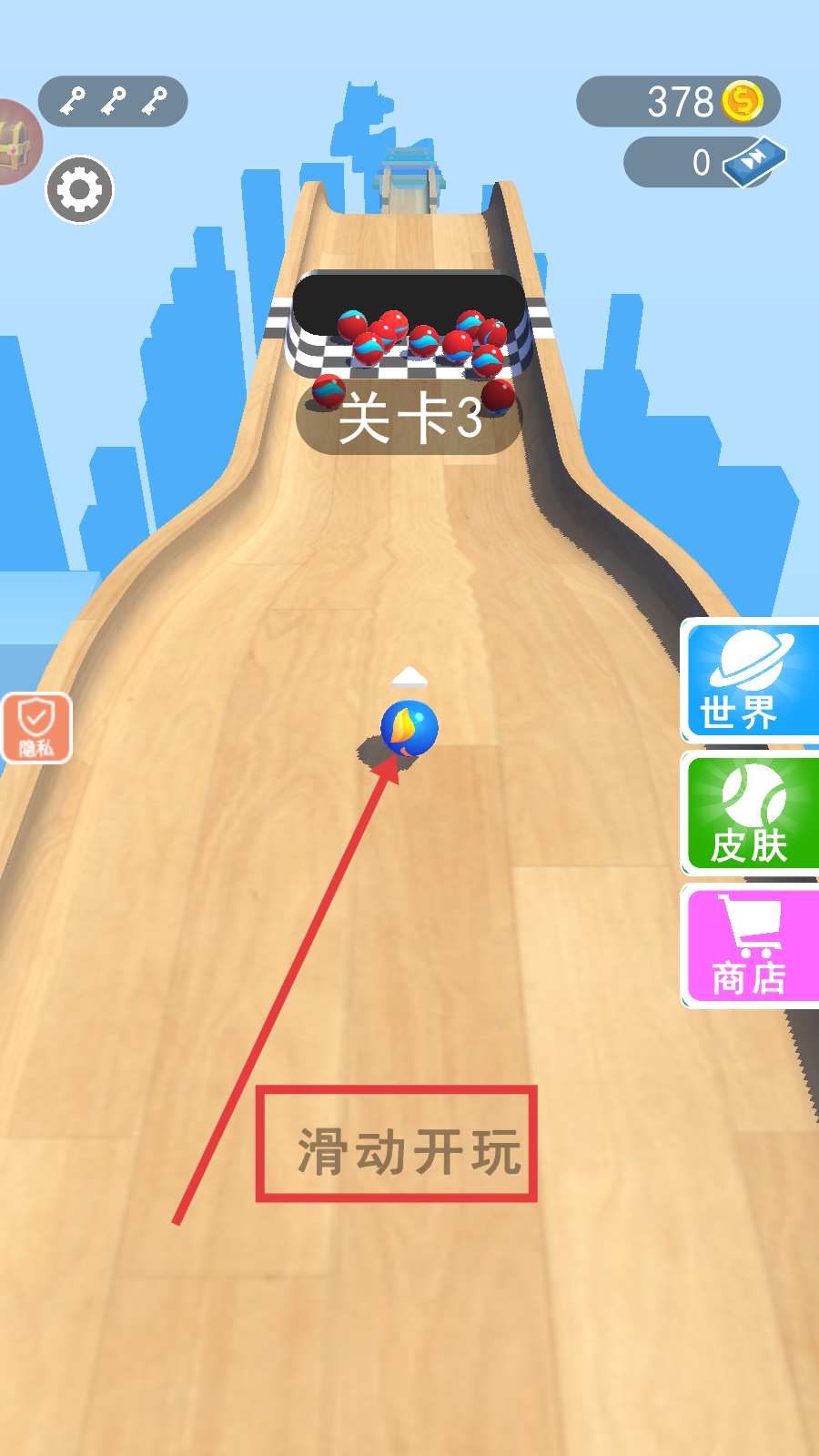 1、看到【关卡3】,按照提示【滑动开玩】,操控小球开始关卡挑战。