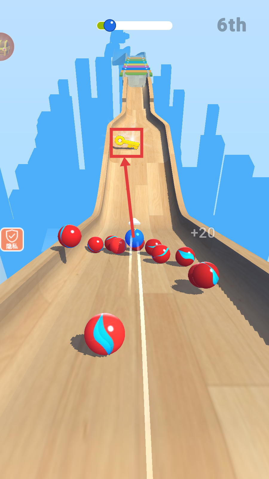 2、赛道中出现【黄色钥匙】,尽量操控小球去获取,同时避开红色小球,还能获得积分。