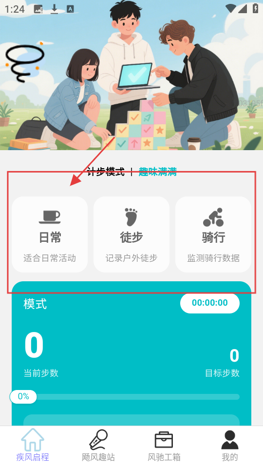 1、在首页,有日常、徒步等计步模式,选目标模式,进入模式设置页面。