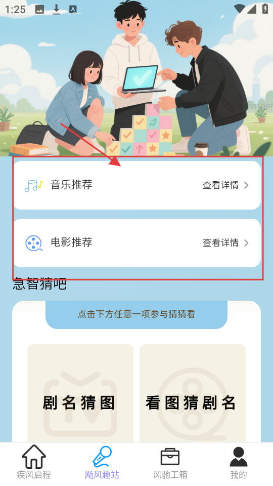 3、到飏风趣站页,有音乐推荐、电影推荐等,选【音乐推荐】,进入音乐推荐列表页。