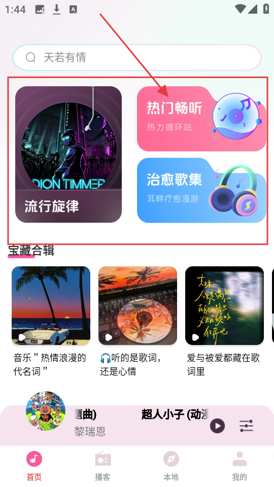 1、在首页,有流行旋律、热门畅听等歌单分类,选【治愈歌集】,进入治愈系歌集页面。