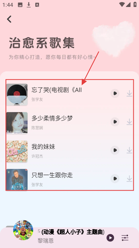 2、在治愈系歌集页面,有《忘了哭》等歌曲,选目标歌曲,进入其播放详情页。
