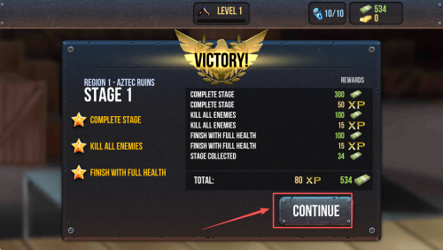 4、如何领取奖励?关卡结束显示“VICTORY!”与总计534金币、80XP,点击“CONTINUE”进入下一关。