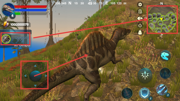 2、狩猎技能运用:使用撕咬等技能捕捉猎物,借助小地图查看猎物和其他恐龙方位,制定狩猎策略。