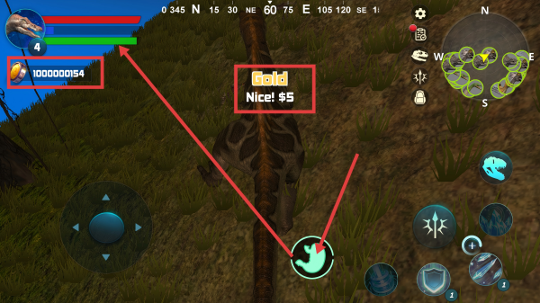 4、完成任务后会获得【Gold-Nice!-$5】等奖励,金币数量增加,还能使用道具恢复恐龙状态,为后续战斗做准备。