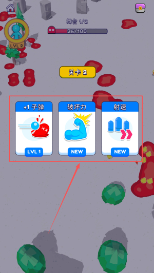 3、如何升级与进第二关?在“御台1/2”界面查看26/100进度,点击“+1子弹”“破坏力”“射速”提升属性,再进“关卡2”解锁NEW武器。