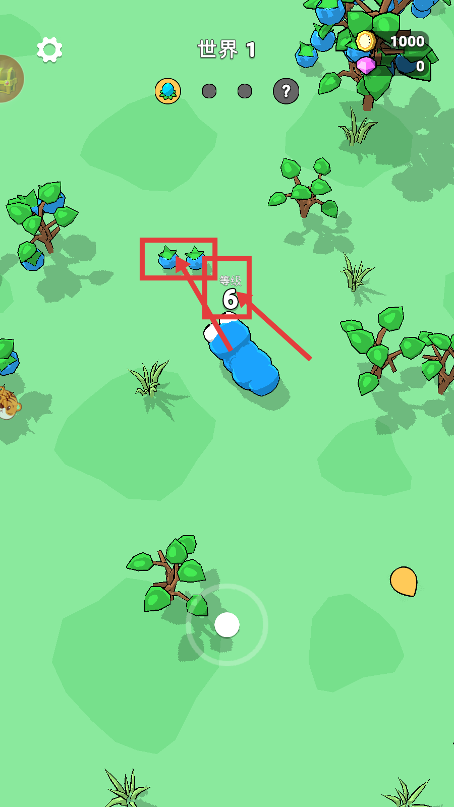 2、操控蓝色生物移动,靠近蓝色带绿叶的物体,借助【等级6】的能力,收集这些物体以提升自身。