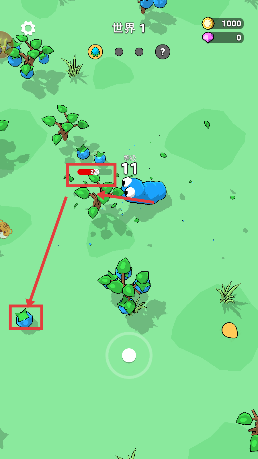 3、攻击树木时,关注上方【2/4】的进度条,持续攻击直至树木被破坏,获取掉落的蓝色带绿叶物体。