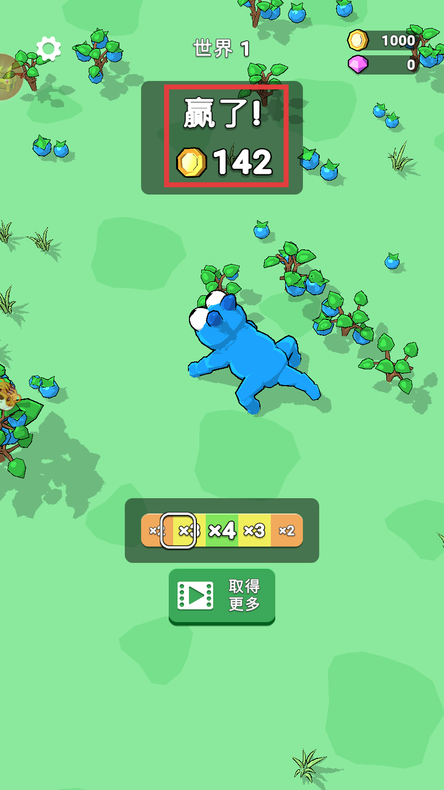 4、成功通关后,屏幕显示【赢了!】,并获得【142】金币奖励,可通过观看视频“取得更多”奖励,积累资源用于后续关卡。