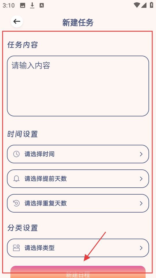 2、在新建任务页,输入任务内容,选时间、提前天数等,完成后点【新建日程】。