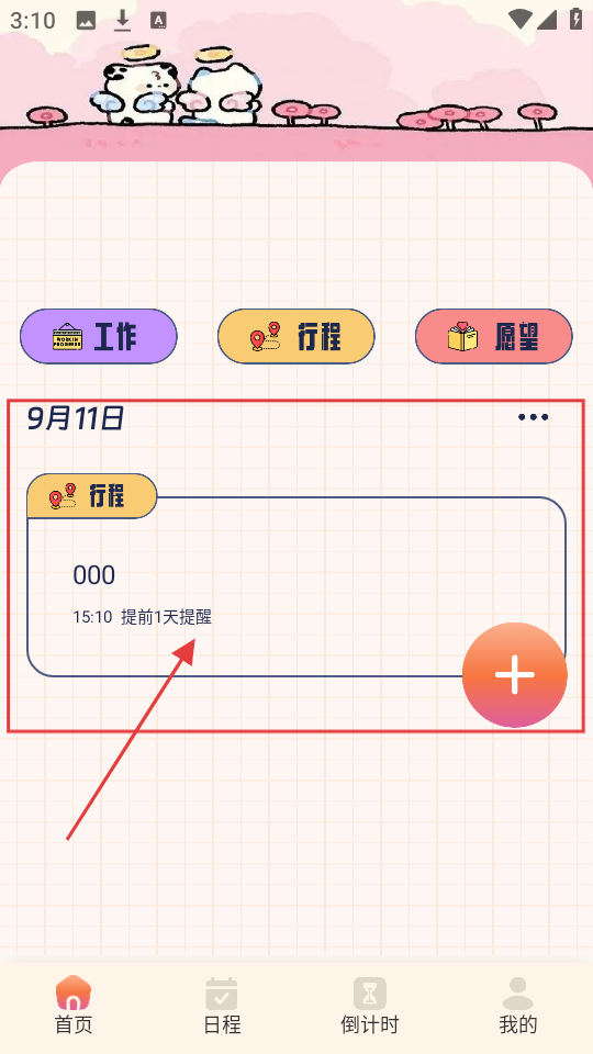 3、新建日程后,在首页可看到行程任务,含时间、提醒等信息,方便查看管理。