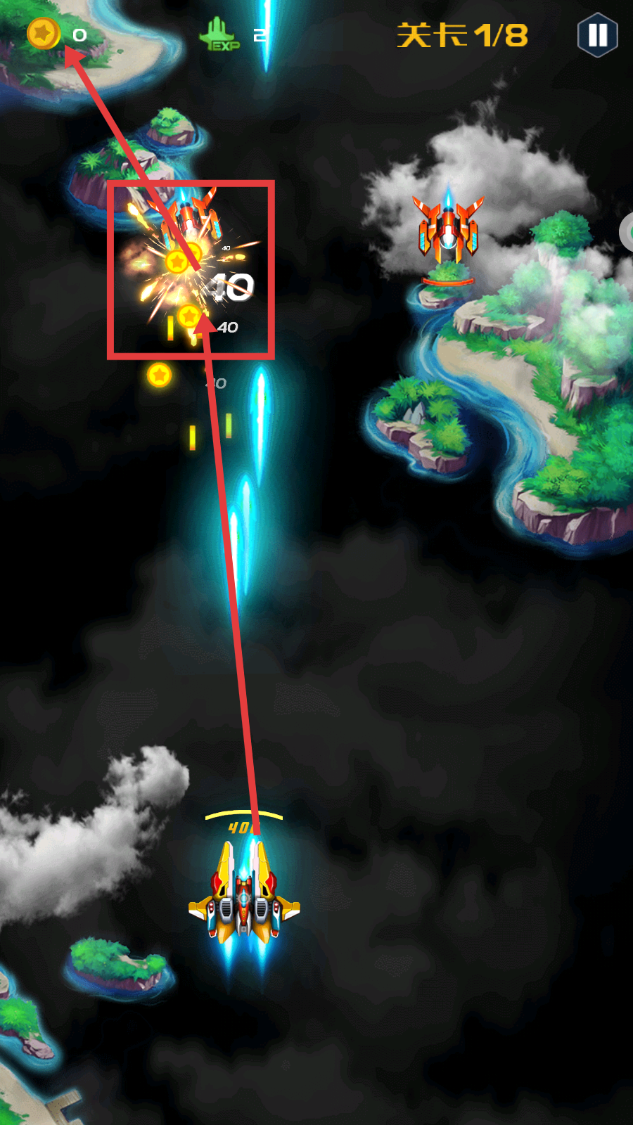 1、进入【关卡1/8】,按照提示【滑动屏幕进行移动】,操控战机开启飞行冒险。