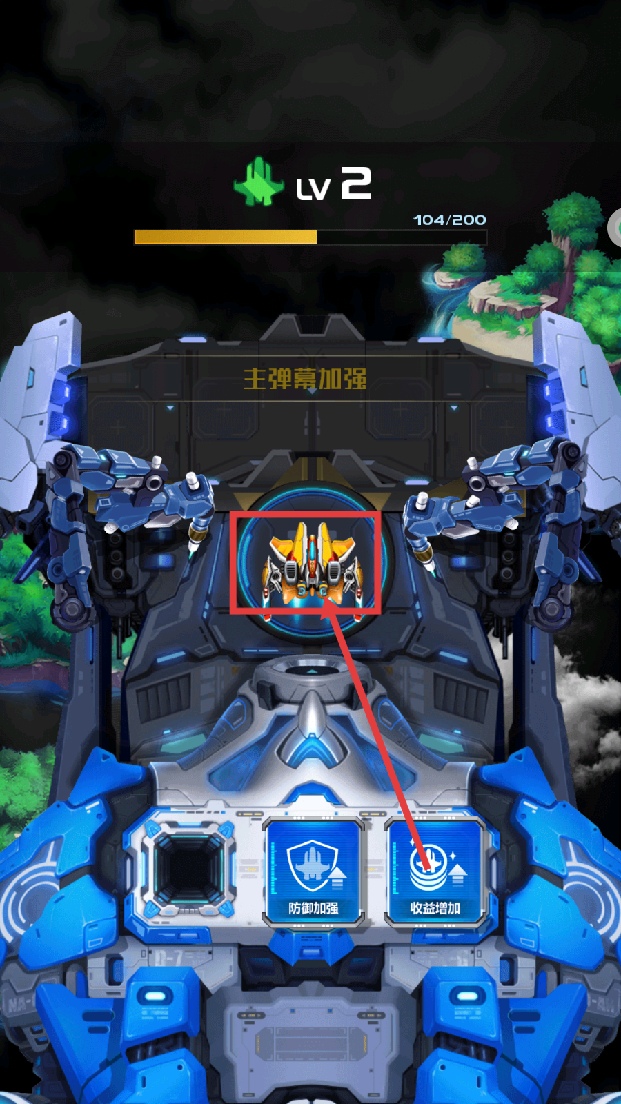 3、升级时可选择【主弹幕加强】,也能挑选【防御加强】或【收益增加】,提升战机作战能力。