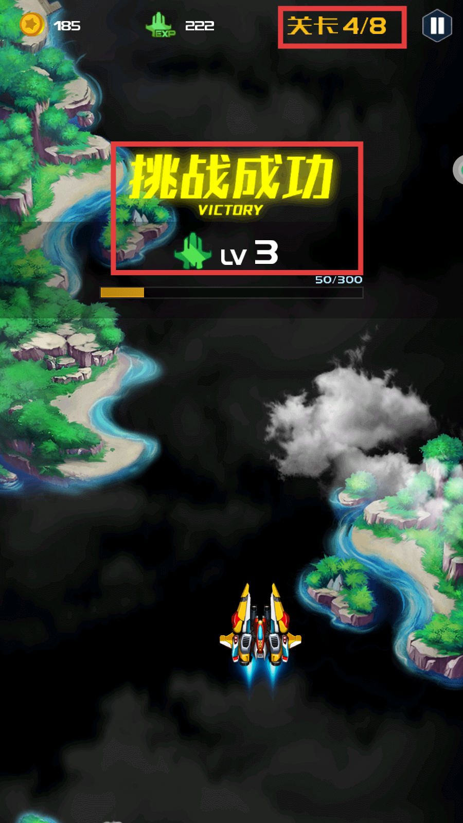 4、成功通关后显示【挑战成功-VICTORY】,战机升至【Lv3】,可继续推进到【关卡4/8】挑战。