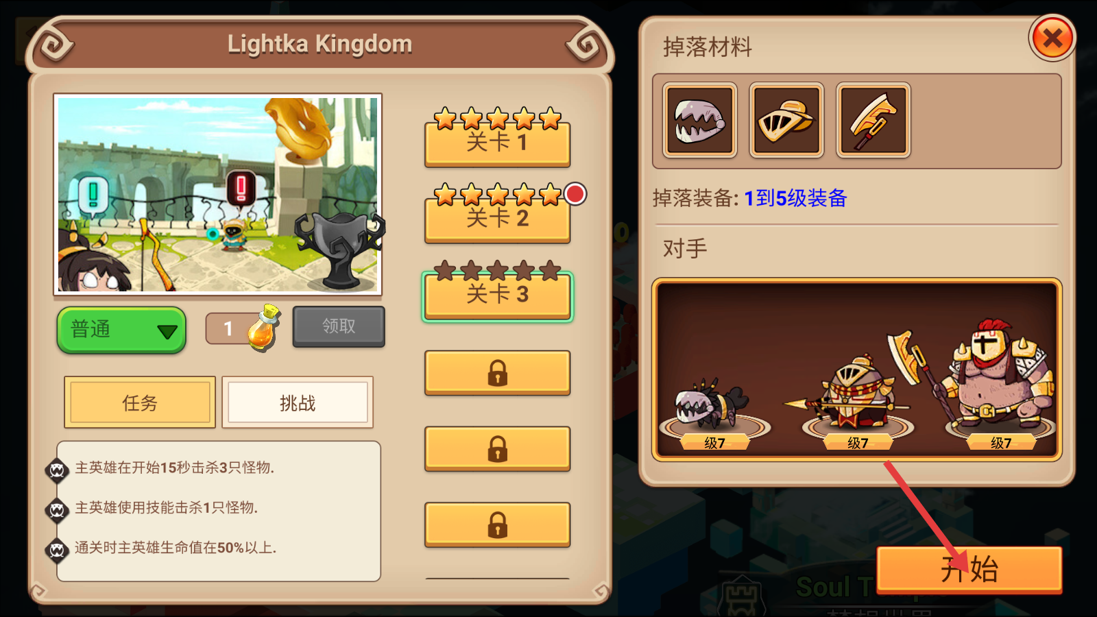 1、进入【Lightka-Kingdom】关卡界面,查看掉落材料、【1到5级装备】及对手后,点击【开始】挑战关卡。