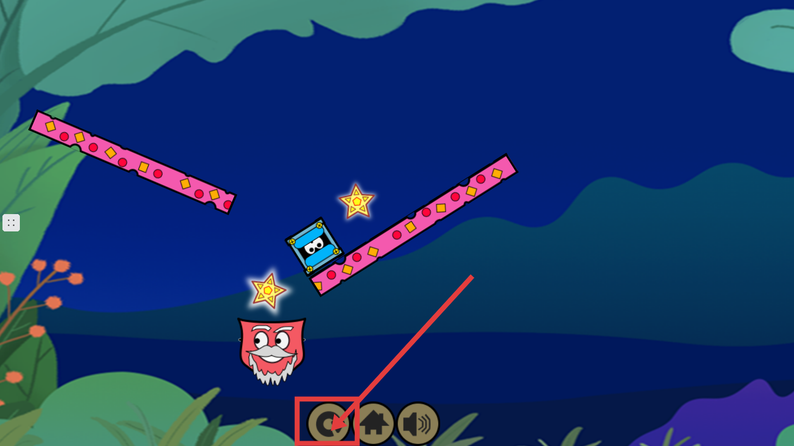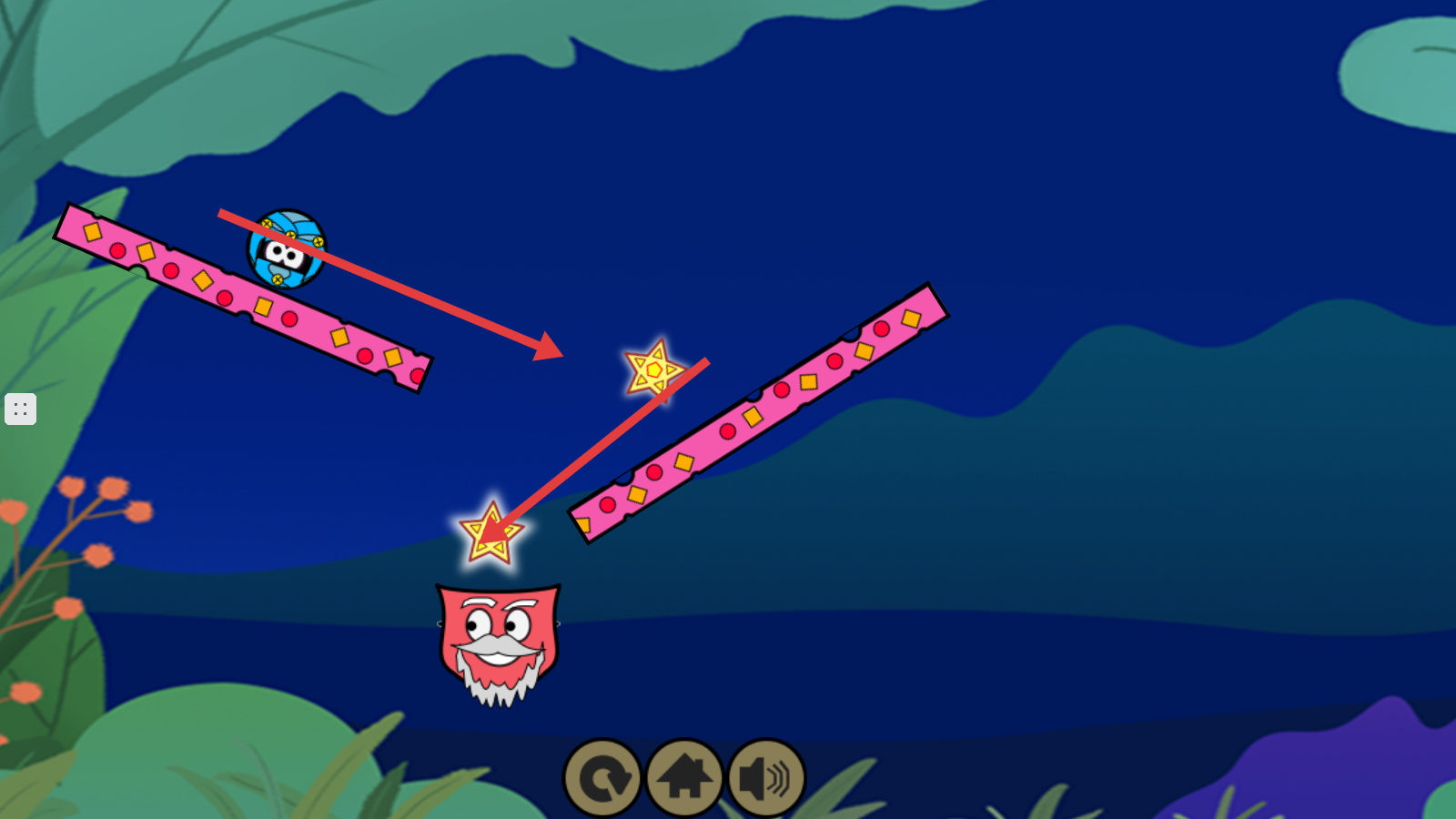 2、操控蓝色角色在粉色斜板上移动,沿着路径收集发光的星星,向目标区域前进。