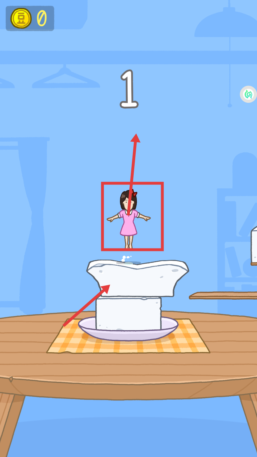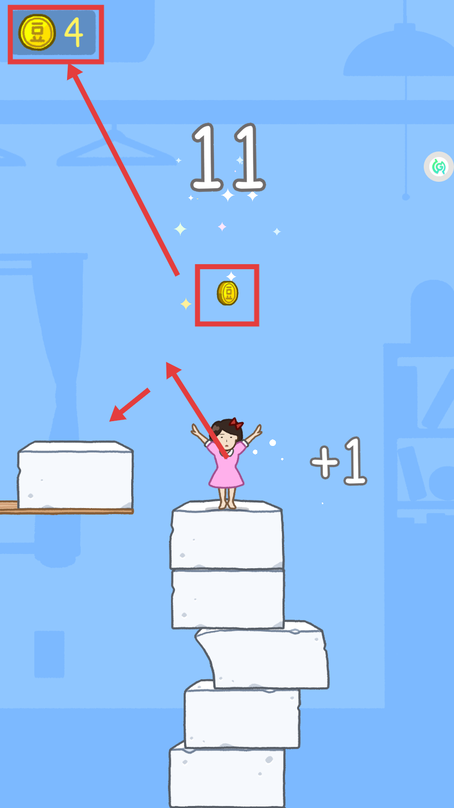 3、堆叠豆腐时,会出现金币,收集这些金币可增加金币数量,像图中就收集到金币,让金币数变为【4】,持续堆叠能获得更多。