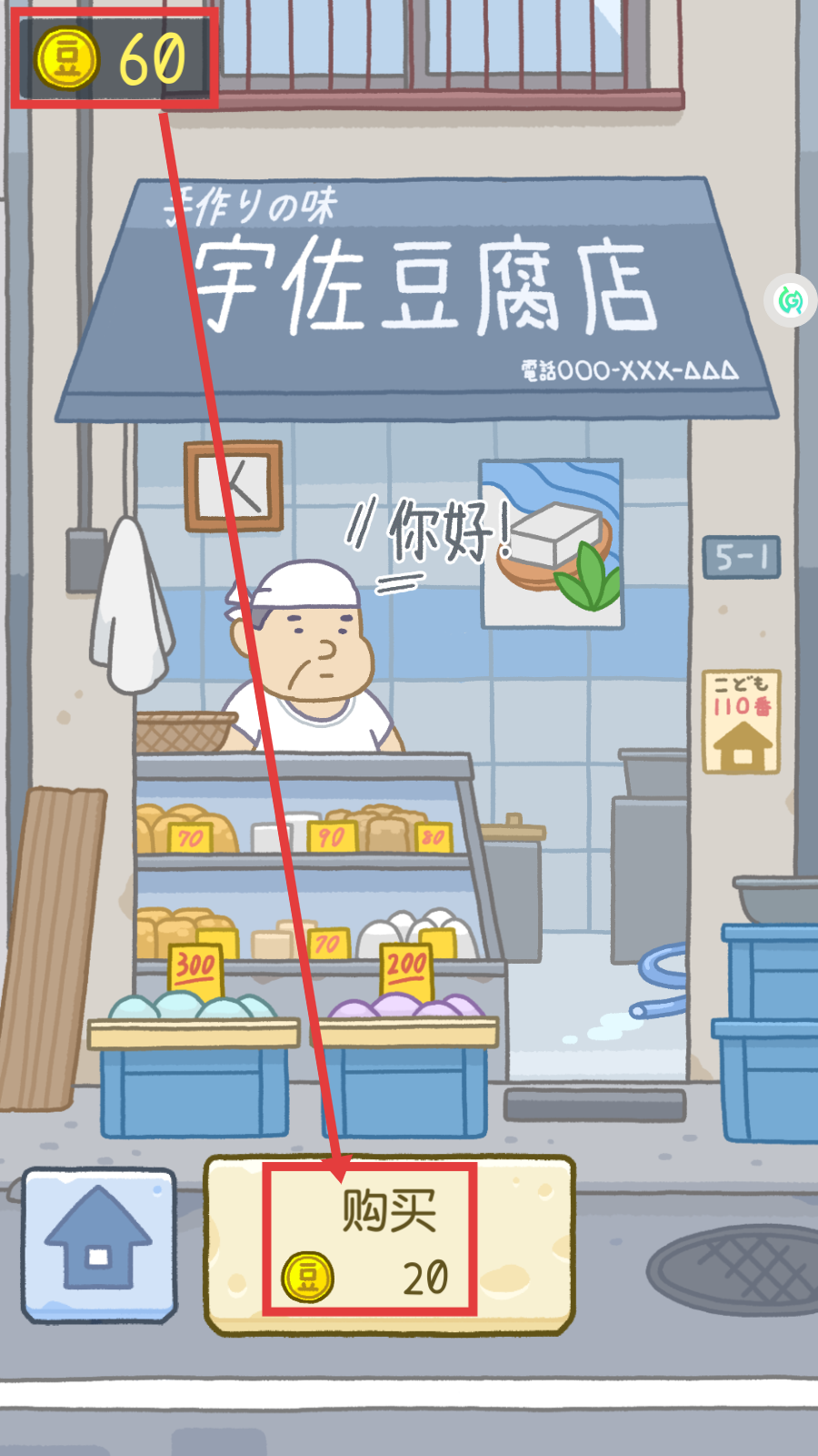 4、积累足够金币后,可前往【宇佐豆腐店】,花费【20】金币点击【购买】,能获取店内的物品,助力游戏后续进程。