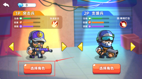 2、如何选择角色?1P点“突击兵”选生命+急速射击,2P点“支援兵”选精准打击后确认。