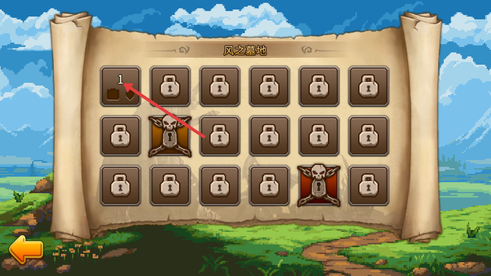 1、进入【风之墓地】关卡选择界面,点击标有“1”的关卡,即可开启第1关的冒险挑战。