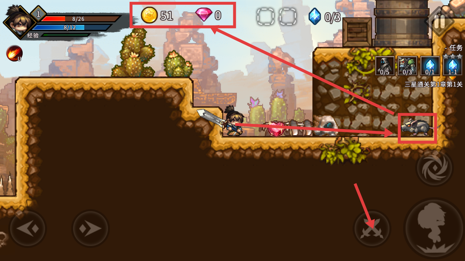 3、遇到老鼠类敌人时,操控角色攻击,成功击败后能获取金币和宝石,积累资源用于强化自身。