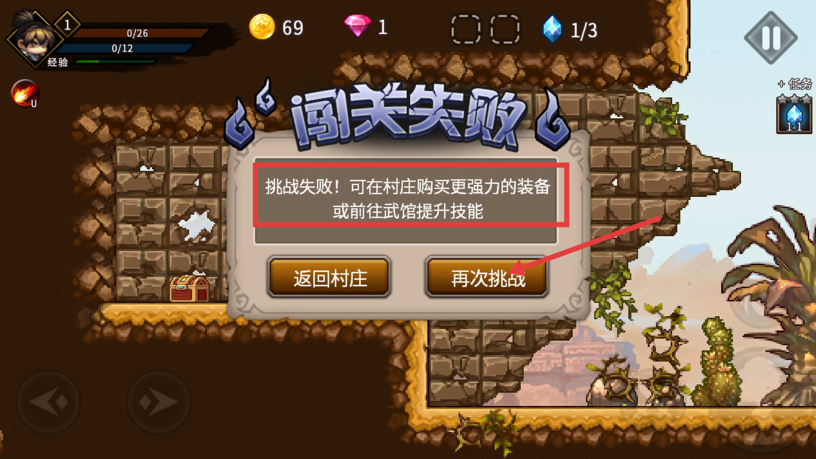 4、若出现【闯关失败】,可选择【再次挑战】,也能返回村庄购买更强装备或去武馆提升技能后再尝试。