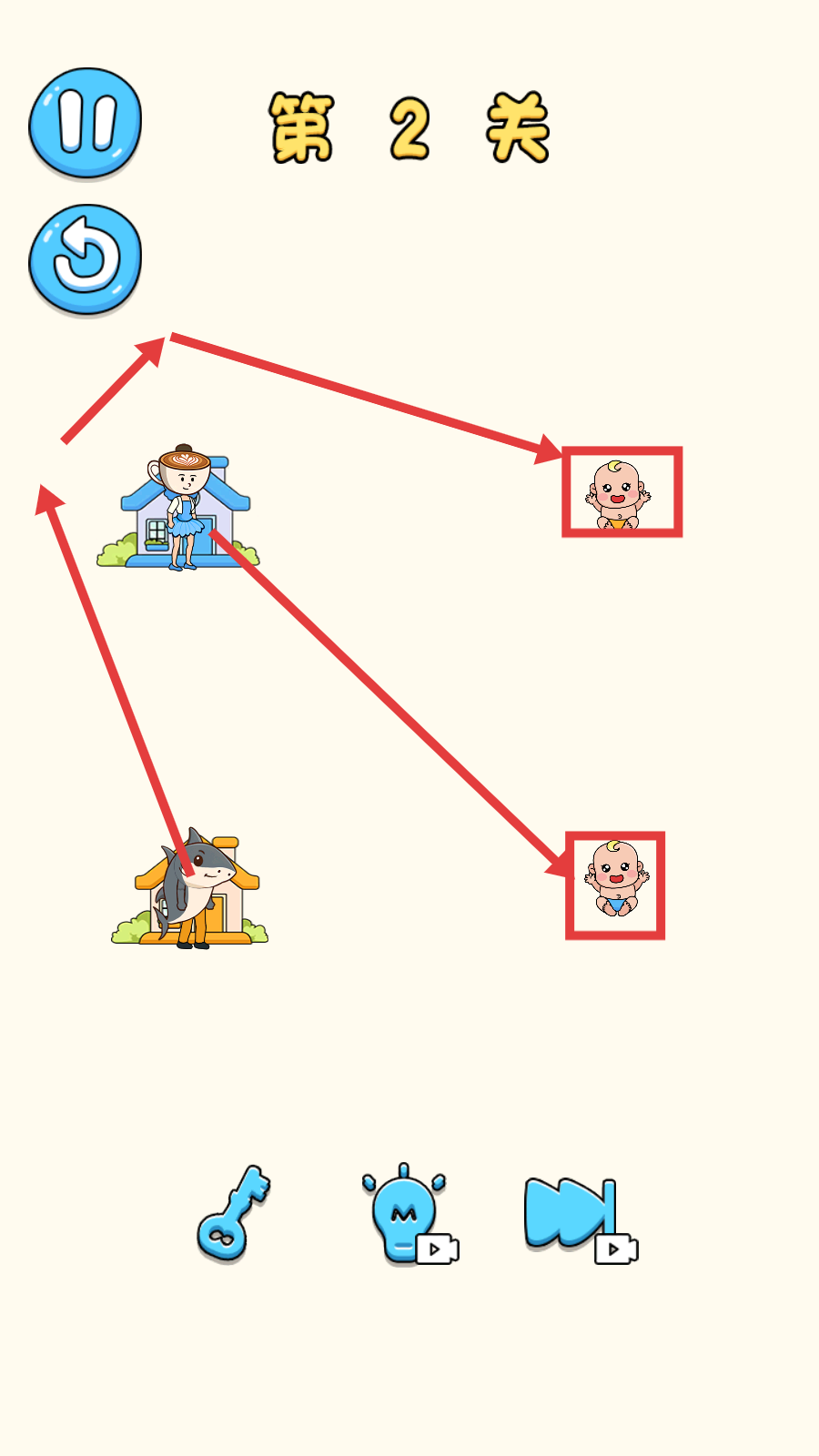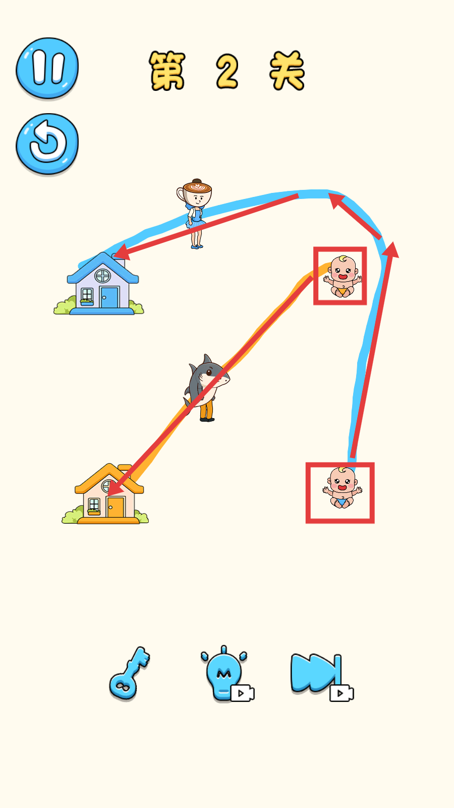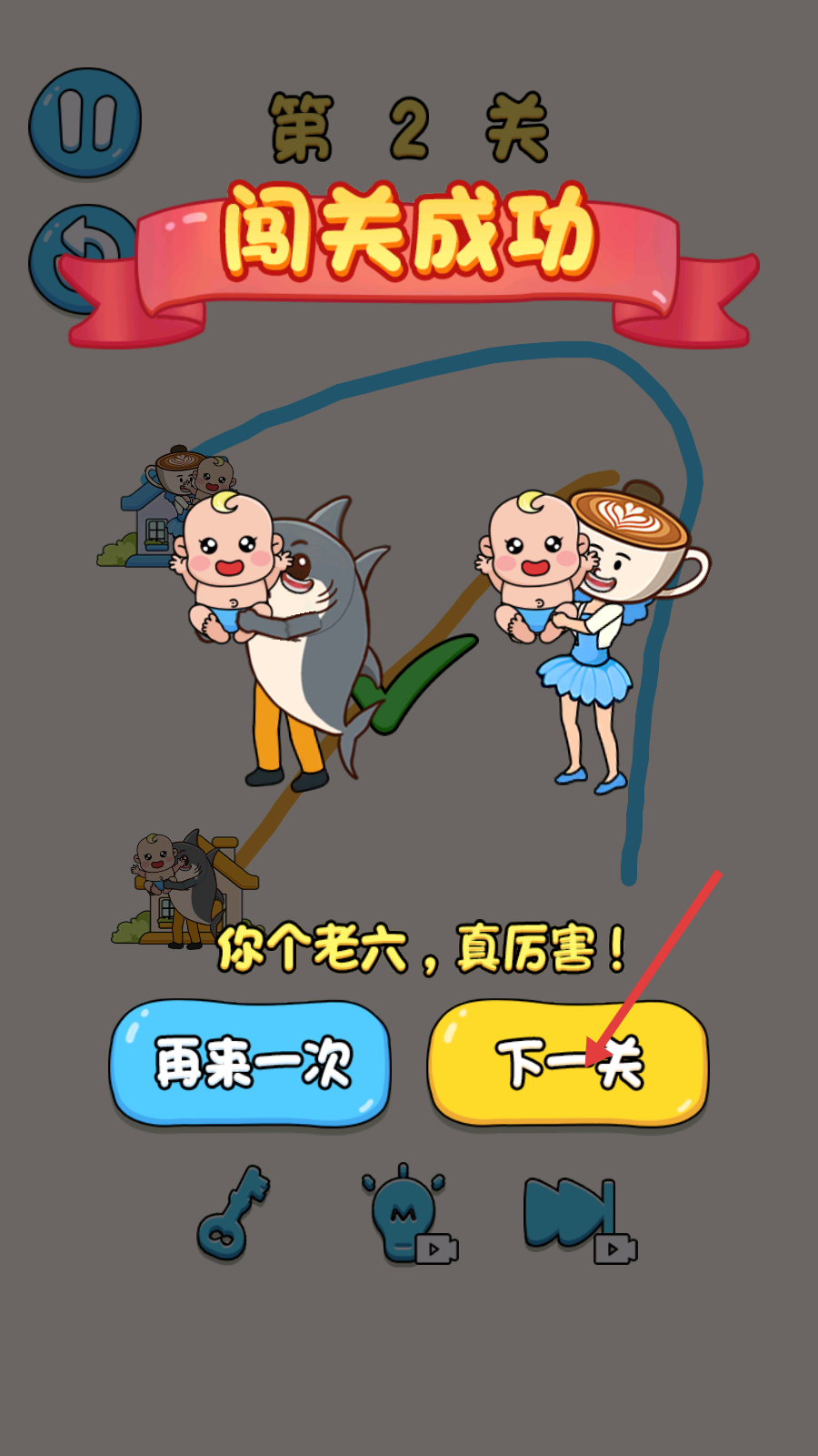 2、在【第2关】中,观察左侧的咖啡杯角色、鲨鱼角色与右侧的婴儿,需规划连线路径,为后续配对做准备。