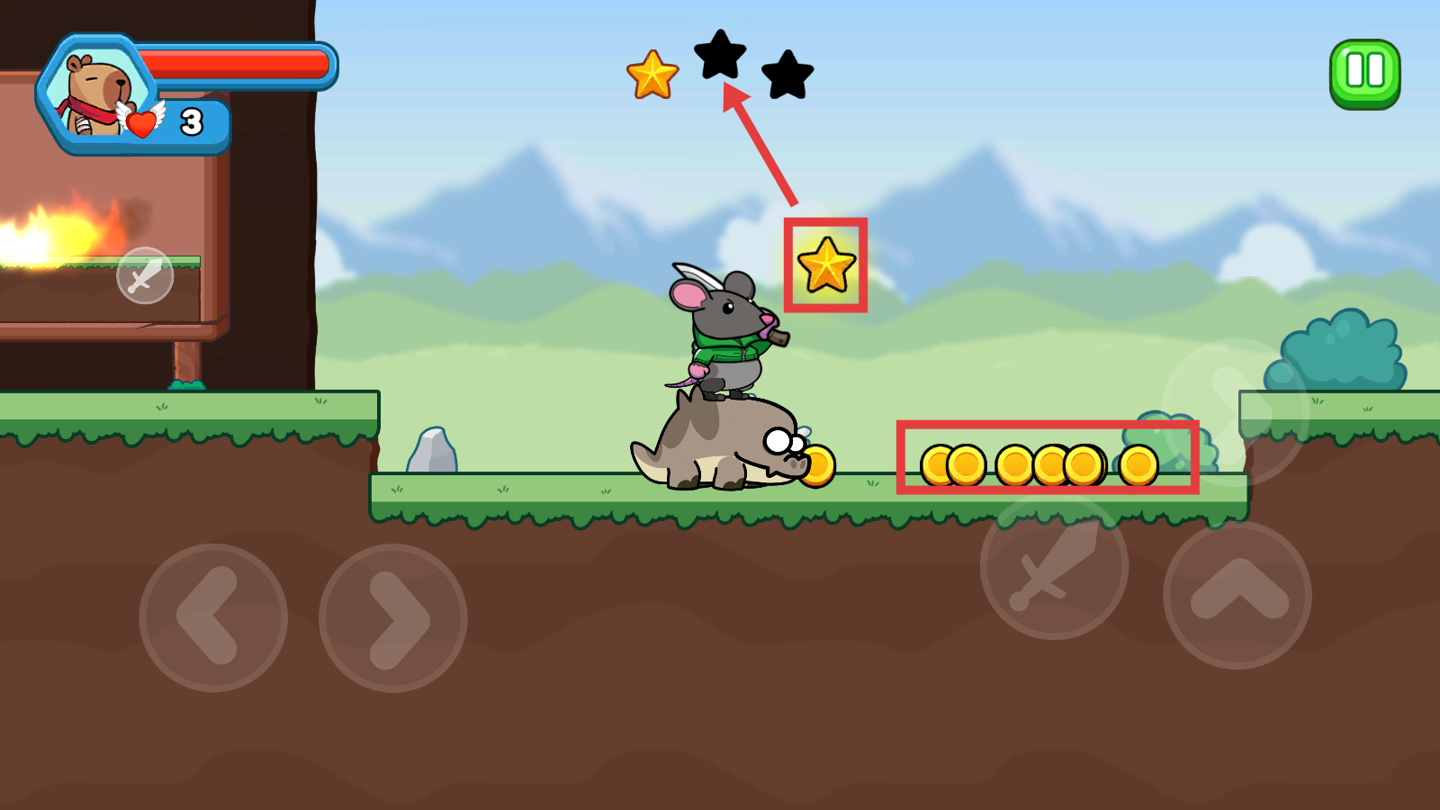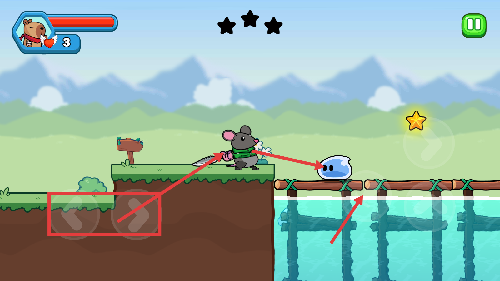2、在第3关中,使用左侧移动按钮操控老鼠角色移动,攻击蓝色怪物,同时小心通过木桥等路径。