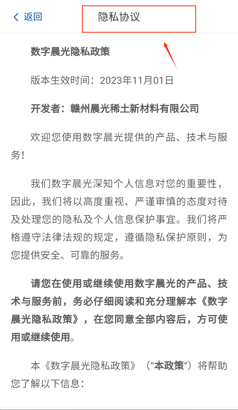 1、 打开软件后呀,首先会看到隐私协议页面,顶部显示当前时间,记得仔细阅读赣州晨光稀土新材料有限公司2023年11月发布的隐私政策。