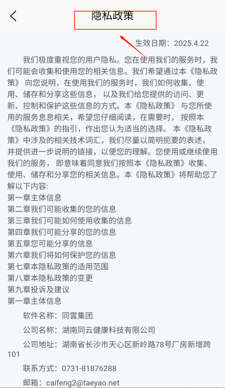 1、 打开软件后,在登录界面能看到顶部显示当前时间,中间有醒目的"隐私政策"标题和生效日期(2025年4月22日),建议仔细阅读。