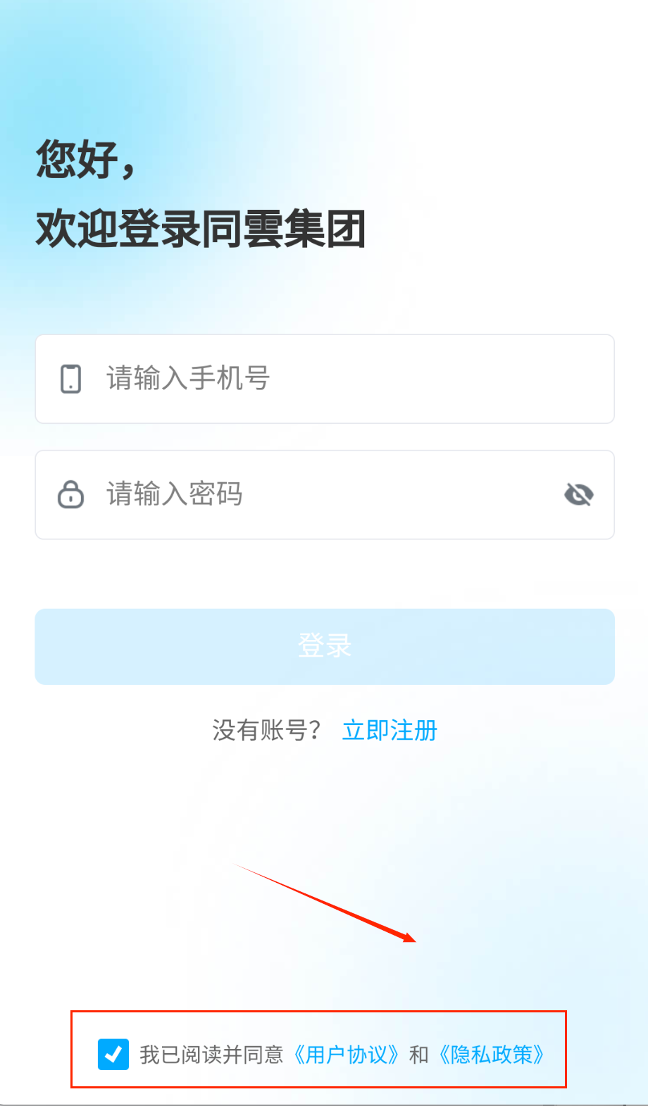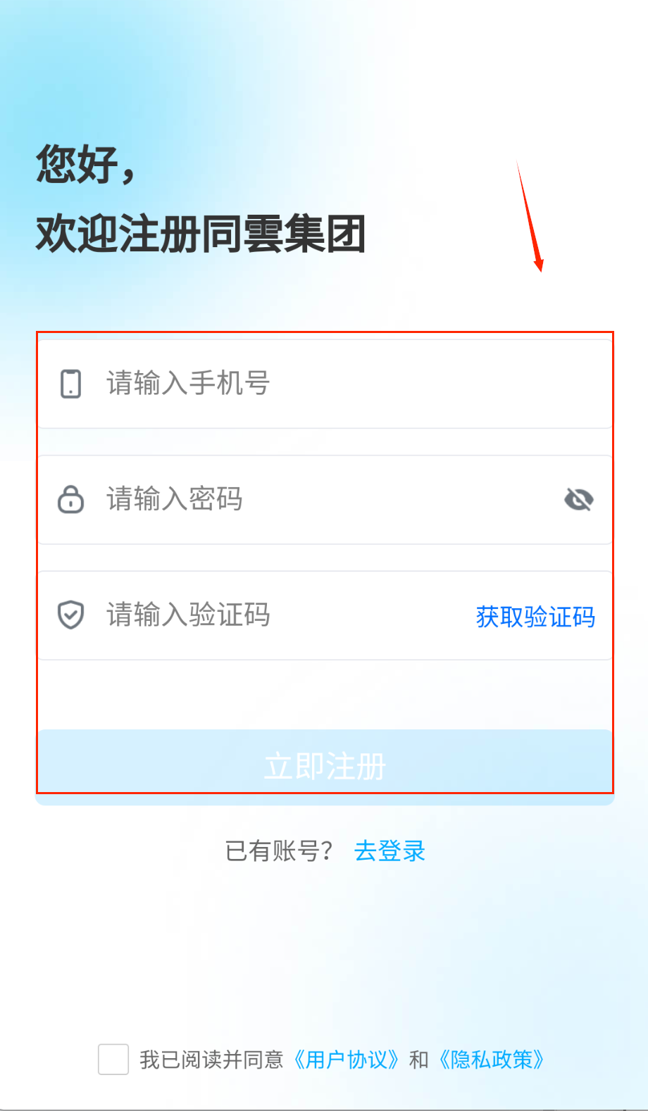 2、 注册新账号时,在蓝色渐变背景的注册页面,顶部写着"您好,欢迎注册同雲集团",在"请输入手机号"框填手机号(左边有手机图标)。