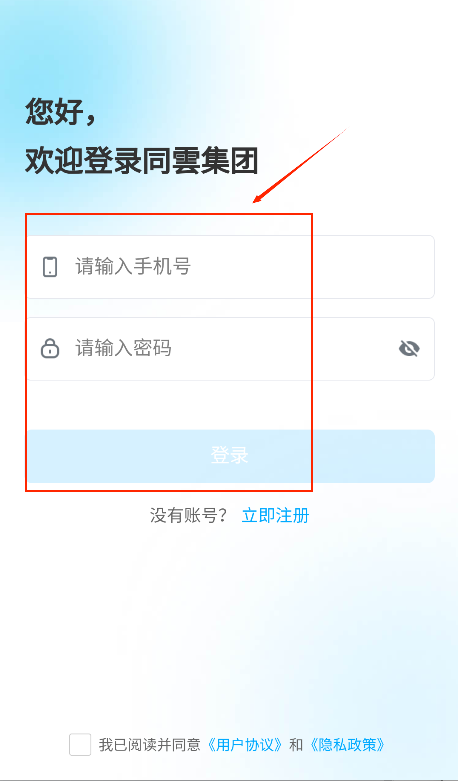 3、 登录账号时,在同样蓝色背景的登录页,顶部显示"您好,欢迎登录同雲集团",在"请输入手机号"框填注册手机号。