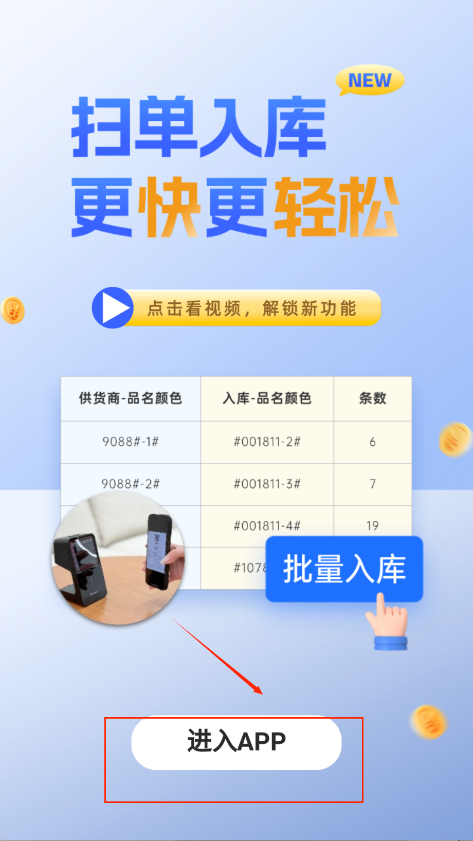 3、 登录成功后想扫单入库的话,注意看首页那个显眼的“点击看视频,解锁新功能”按钮,点进去看看教学视频能快速学会基本操作。
