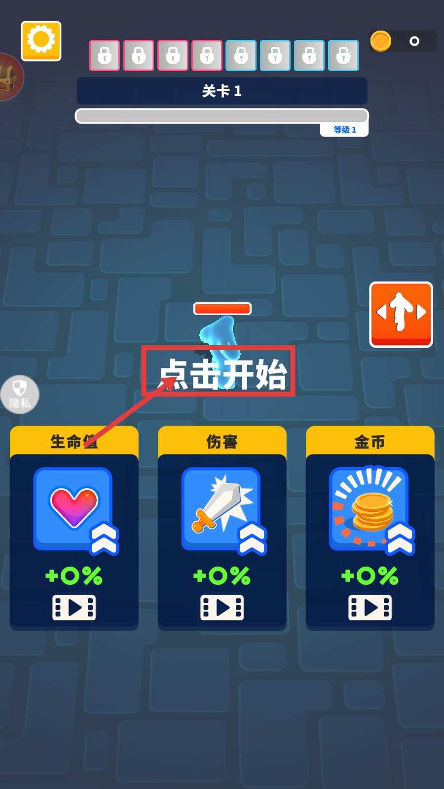 1、点击【点击开始】进入关卡1,可查看【生命值】【伤害】【金币】的加成情况,准备开启挑战。