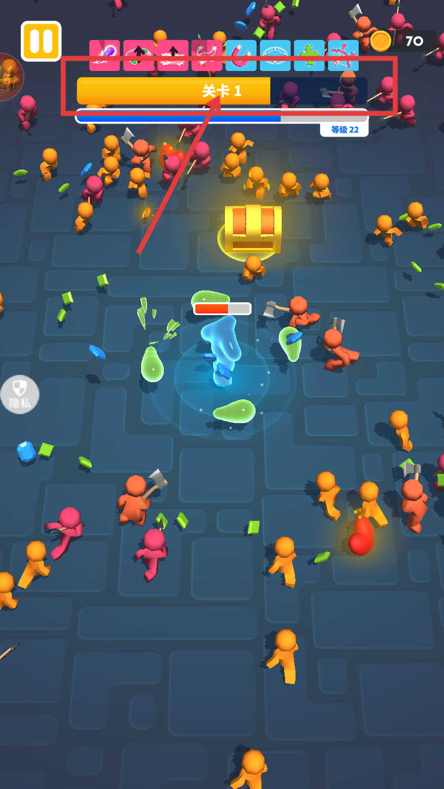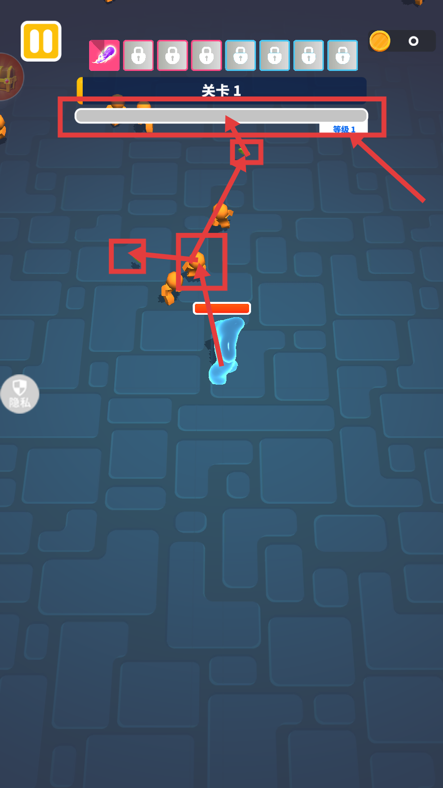 2、在关卡1中,操控蓝色角色与橙色敌人战斗,留意上方的进度条,推进关卡1的进程。