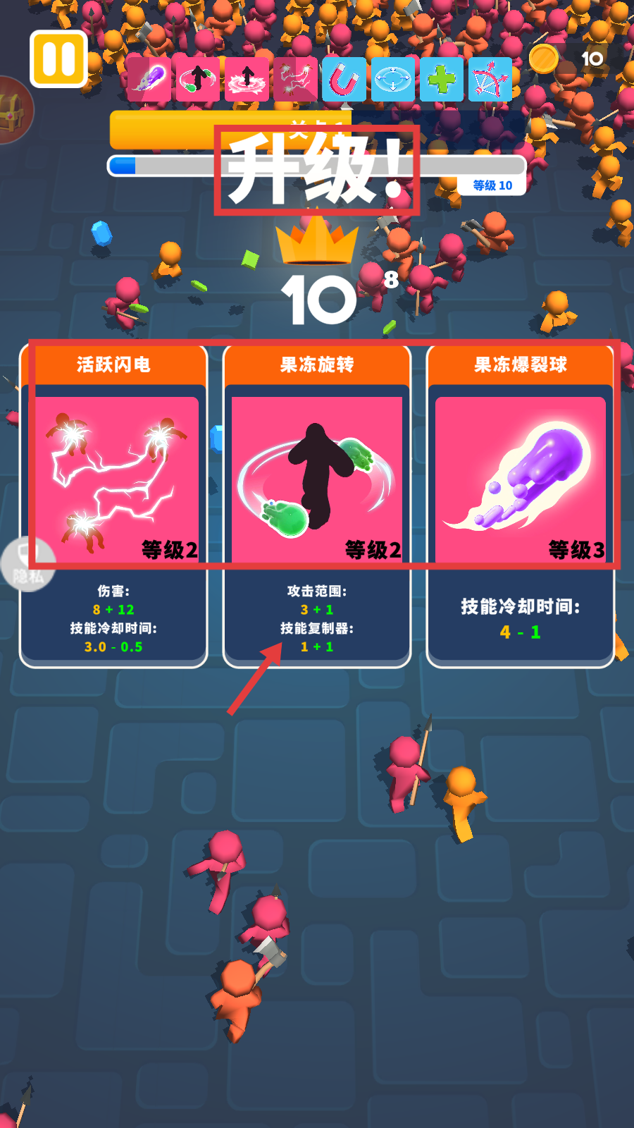 3、升级时,可从【活跃闪电】【果冻旋转】【果冻爆裂球】中选择技能,增强角色的伤害、攻击范围等属性。