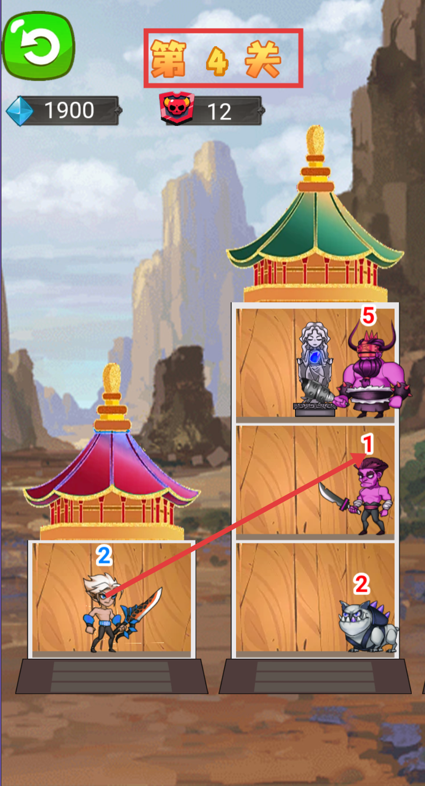 1、第4关开始时,观察双方角色数值,操控己方数值2的角色,应对敌方不同数值的敌人,开启战斗。