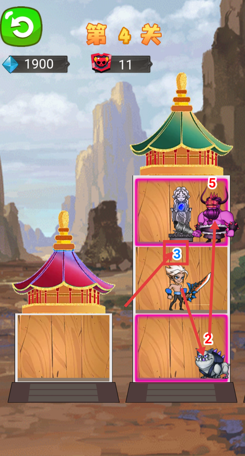 2、战斗过程中,将己方角色移动到敌方塔的对应层,利用数值3的角色对抗数值2、5的敌人,逐步推进战斗。
