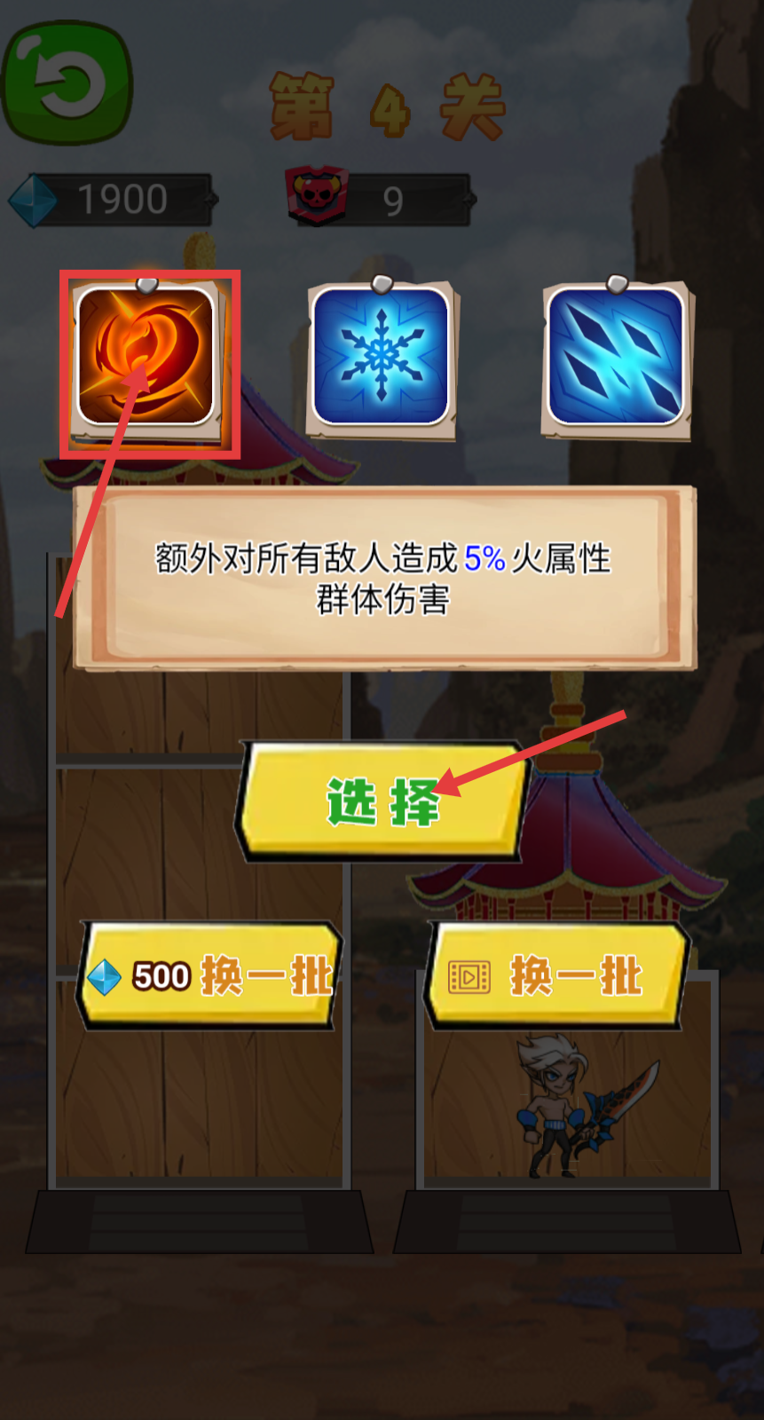3、出现技能选择时,挑选【额外对所有敌人造成5%火属性群体伤害】的技能,点击【选择】按钮,增强群体输出能力。