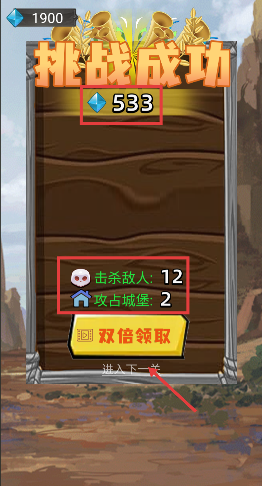 4、挑战成功后,可获得533钻石,还能看到击杀敌人12个、攻占城堡2个,点击“进入下一关”继续挑战。