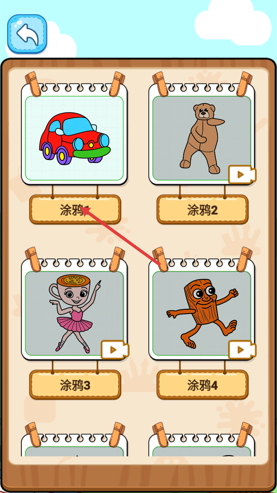 1、进入涂鸦选择界面,点击“涂鸦1”,开启汽车图案的涂鸦挑战。