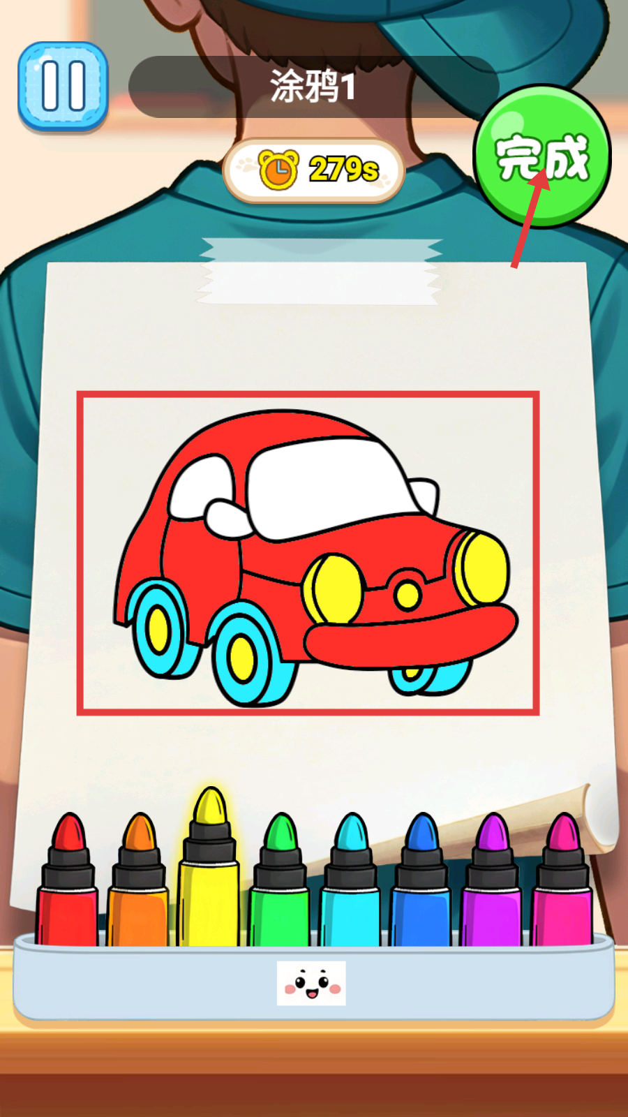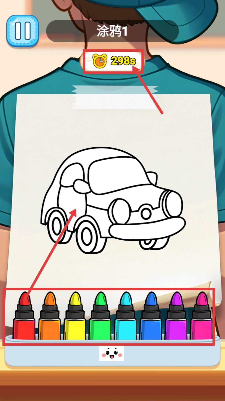2、在“涂鸦1”中,利用下方的彩色马克笔,在298秒内为汽车轮廓涂色,填充不同区域。