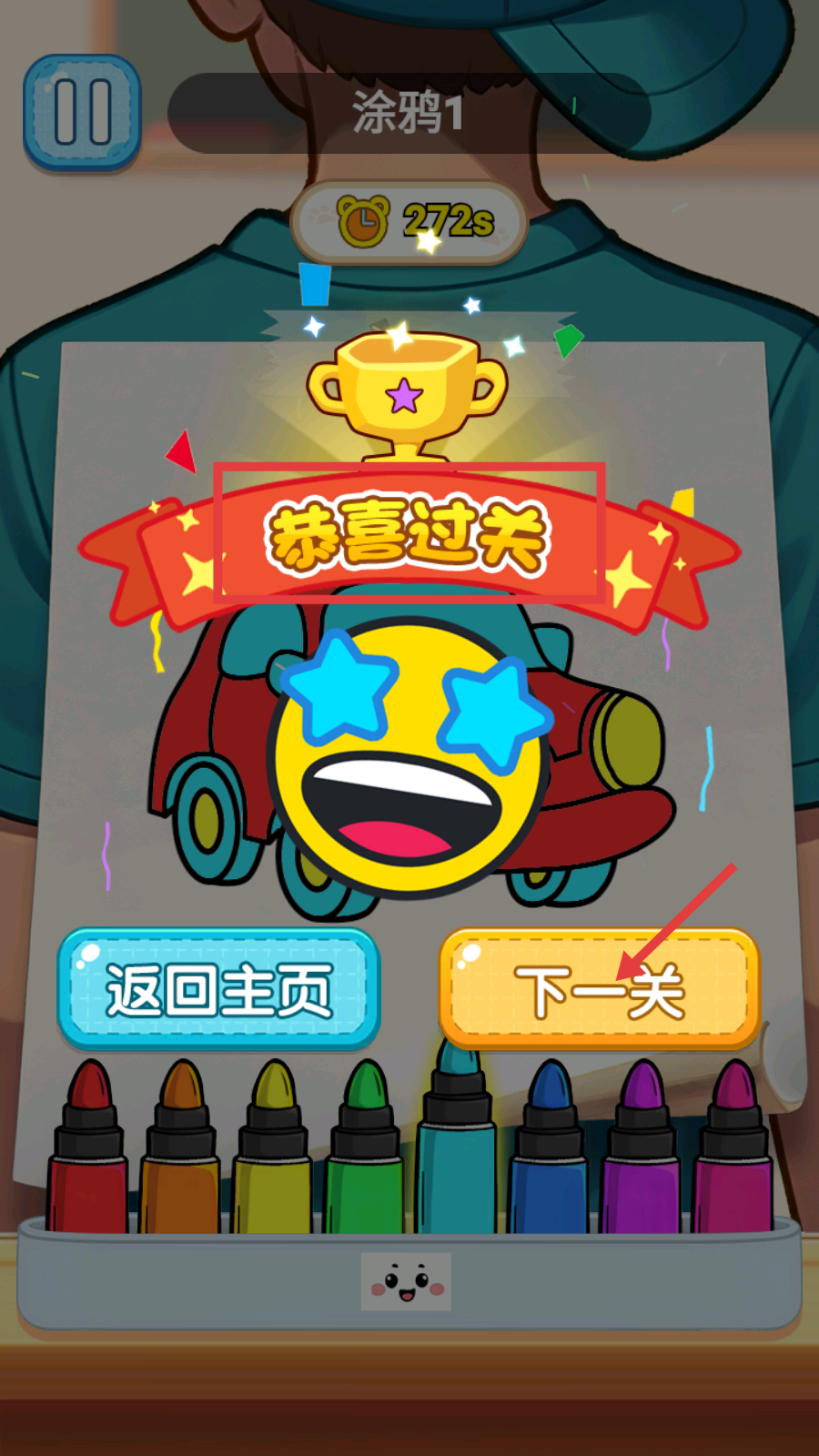 4、成功过关后,界面显示“恭喜过关”,点击“下一关”按钮,继续后续的涂鸦挑战。